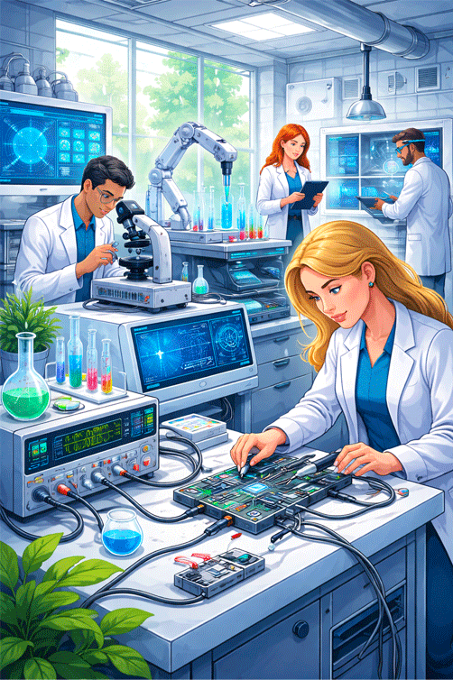 Chez ES France, un projet Laboratoire / R&D se conçoit comme un système : instruments, capteurs, acquisition, logiciel, puissance, RF et intégration mécanique/électrique. Nous coordonnons ces briques pour délivrer une solution cohérente, testable, évolutive et maintenable.
