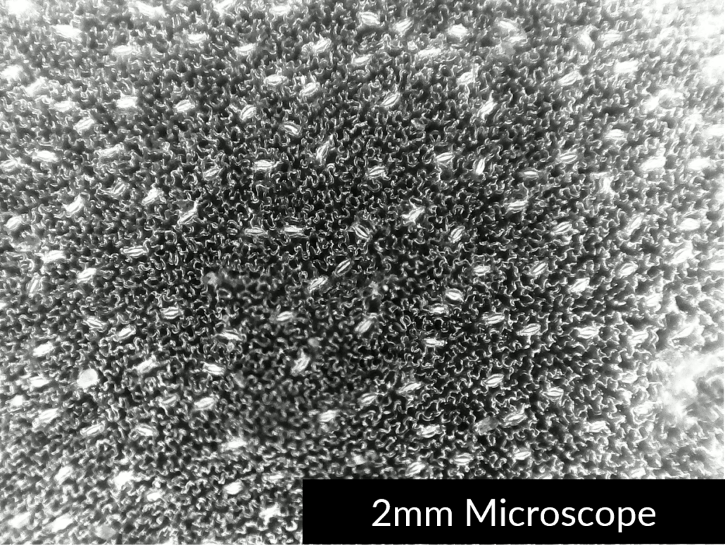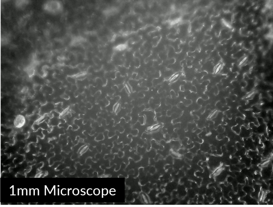 Les images ci-dessus ont été prises avec les microscopes pliables ioLight de 1 mm et 2 mm.Elles montrent les stomates d'une feuille de fève (Vicia faba). La feuille, restée attachée à la tige, a été aplatie à l'aide d'une lame de verre pour faciliter l'imagerie, comme illustré en haut de cet article. Grâce au contraste élevé du microscope ioLight, les stomates et les cellules de garde environnantes sont discernables. Le champ de vision de 1 mm offre plus de détails, tandis que celui de 2 mm offre une plus grande surface d'échantillonnage.