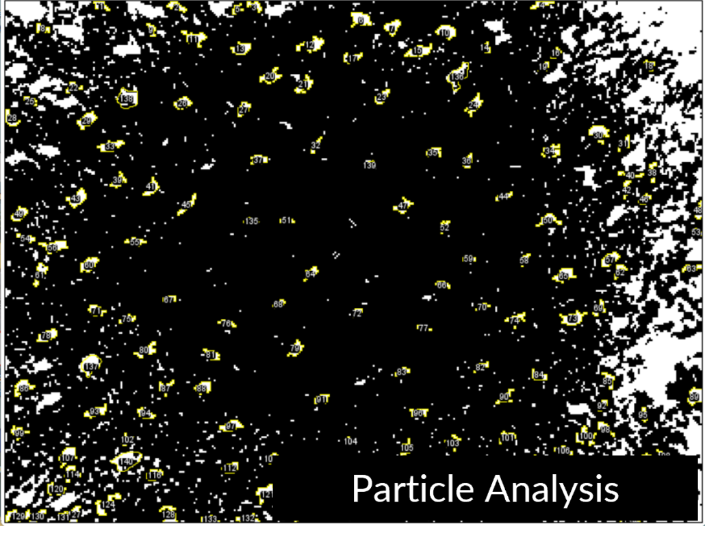 Le microscope ioLight produit une image numérique sur tout téléphone, tablette ou ordinateur portable connecté. Cette image est immédiatement disponible pour une analyse plus approfondie. Dans ce cas, le logiciel tiers gratuit imageJ a été utilisé pour compter les 140 stomates présents dans l'image. Actuellement, ce processus implique des étapes manuelles, telles que le seuillage de l'image pour mieux mettre en évidence les stomates et le réglage des mesures de circonférence et de circularité pour l'analyseur de particules. Néanmoins, cette méthode est plus rapide qu'un comptage manuel. L'utilisation de l'IA pour effectuer des comptages stomatiques et obtenir une meilleure compréhension de leur taille et de leur état permettrait d'améliorer encore le temps de traitement des images.