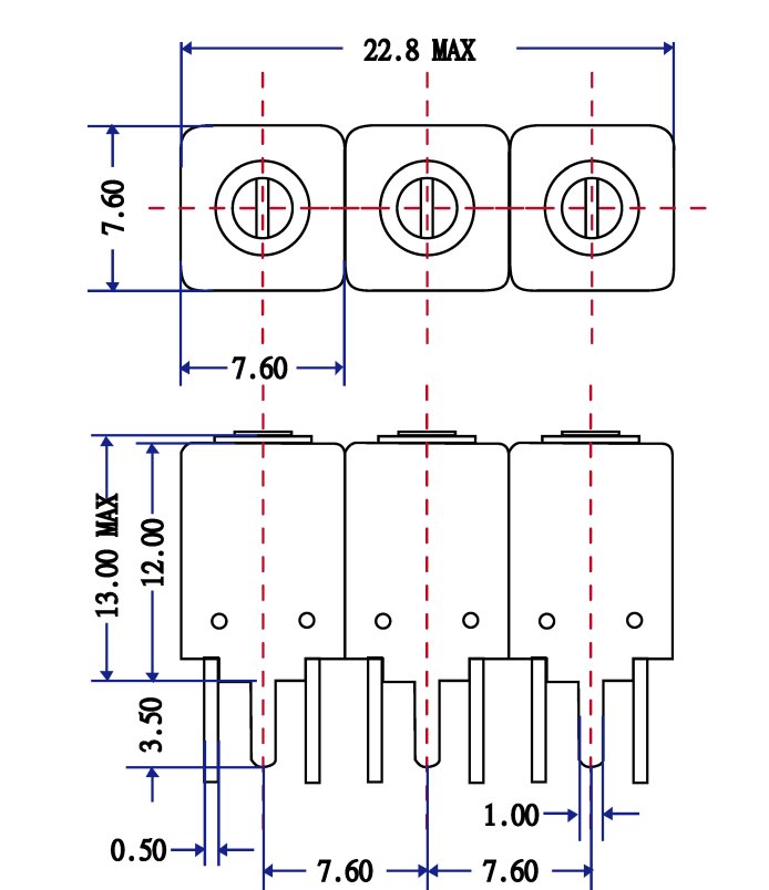 Encombrement commun aux versions 7H3 en boîtier Pin/THT : largeur 22,8 mm (max) • profondeur 7,60 mm • hauteur 12,0 mm typ / 13,0 mm max • pas entre pins 7,60 mm. Note : vérifier le dessin mécanique de la référence avant routage si suffixe de boîtier différent.