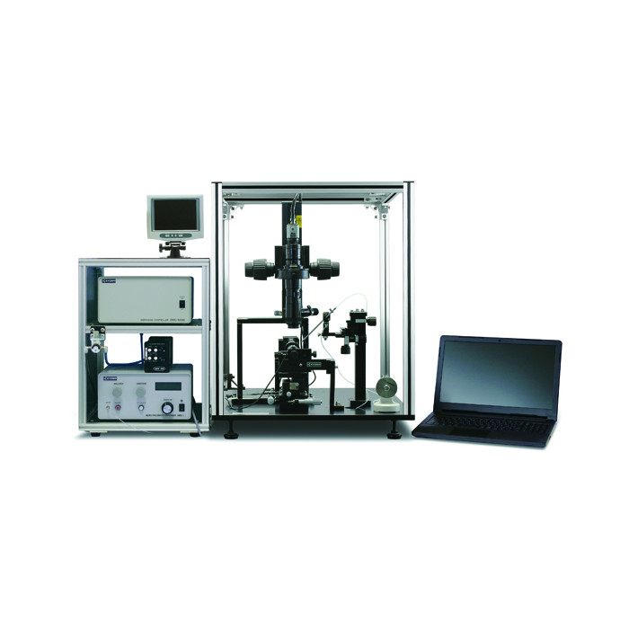 Le MCA-4 est un système de mesure d’angle de contact microscopique intégrant un micro-injecteur électrique de haute précision, une optique à fort grossissement et une double caméra (vue latérale et vue de dessus). Cette architecture permet un dépôt de gouttes ultra-localisé et l’observation fine de la ligne triple solide-liquide-air, même sur des surfaces de l’ordre de 100 × 100 µm.