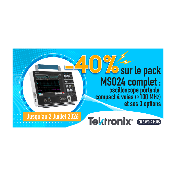 Jusqu'au 2 juillet 2026, pour l'achat d'un oscilloscope MSO24 à partir de 100 MHz (4 voies) associé aux options 2-MSO, 2- ULTIMATE et R3, vous bénéficiez de 40% de remise !