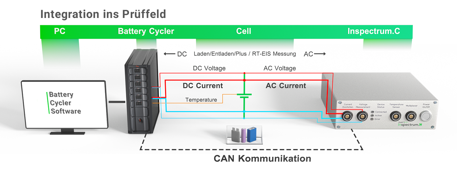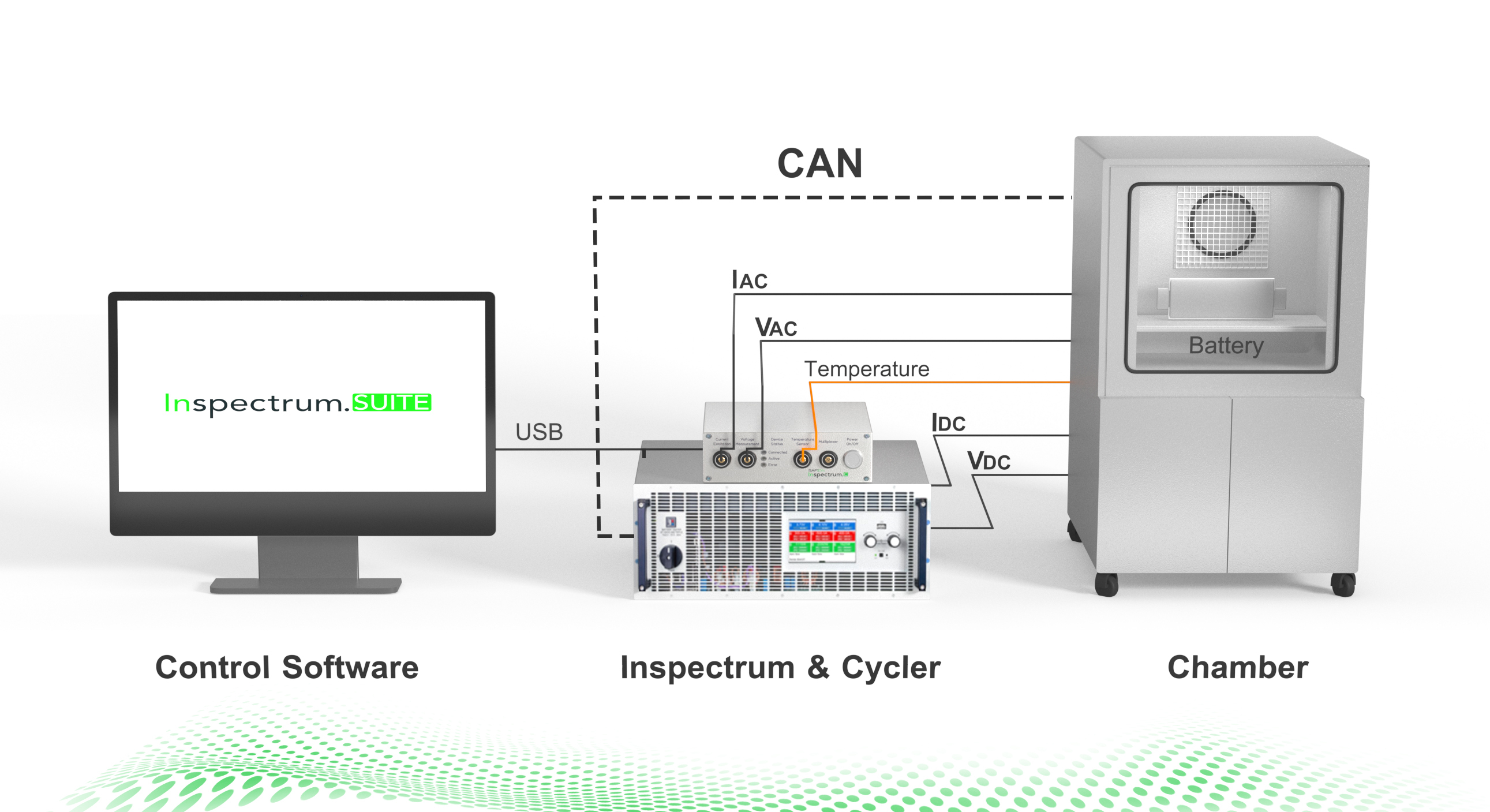 Cette architecture permet de mesurer facilement des cellules présentant une résistance interne inférieure à 0,5 mOhm et une capacité supérieure à 150 Ah. L’appareil peut être utilisé en mode autonome avec un PC via le logiciel Inspectrum.Suite ou intégré dans une infrastructure existante via USB et CAN.