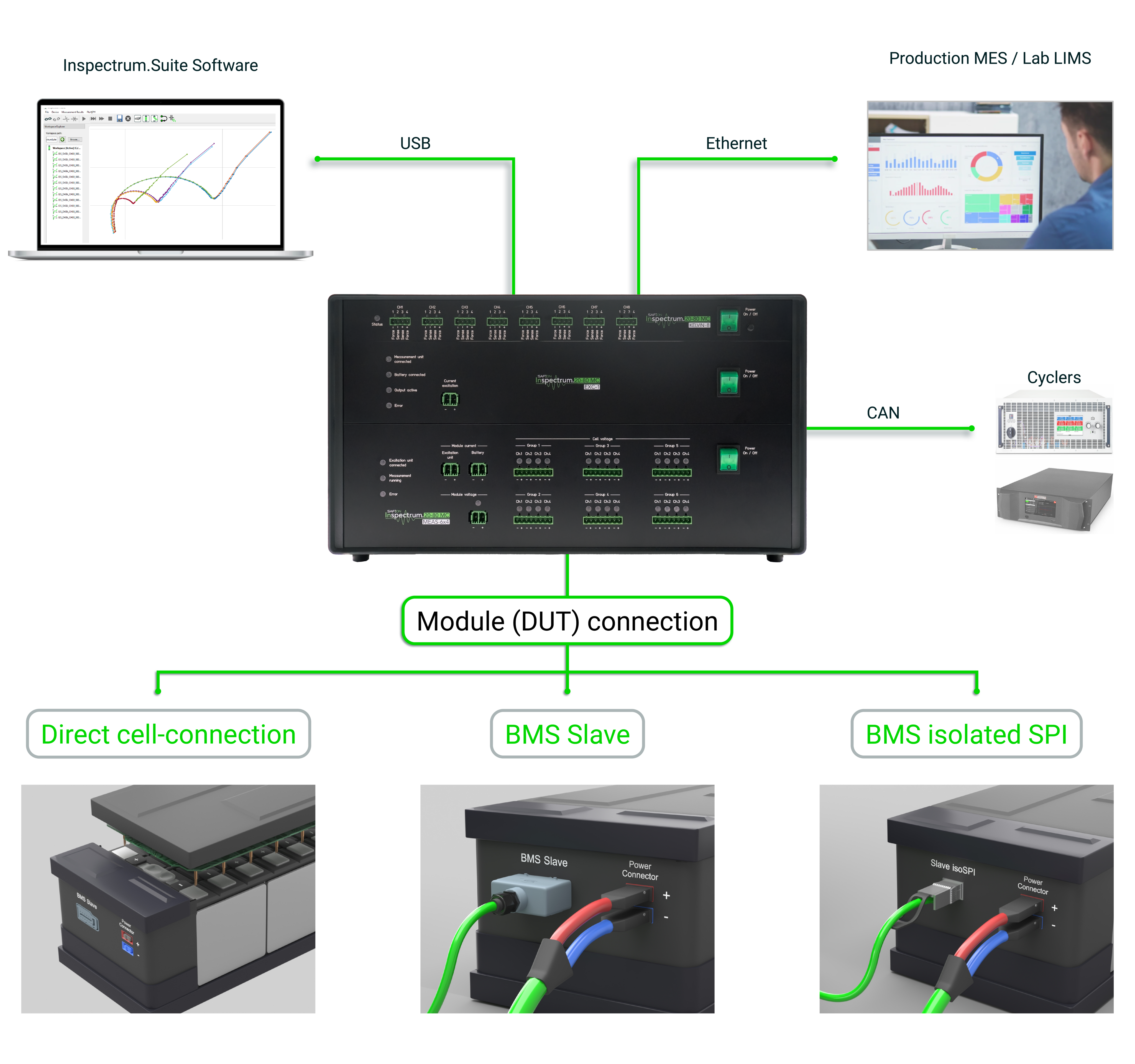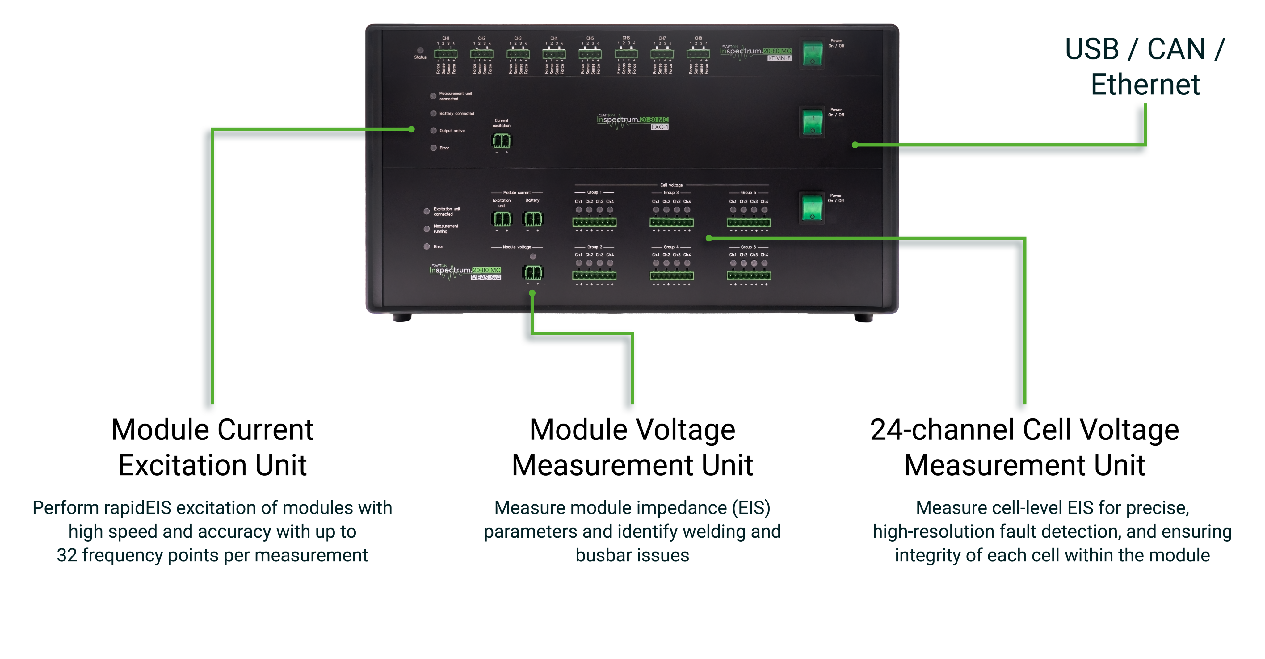 L’Inspectrum.20-80 MC est un système de test destiné à la détection de défauts électriques dans les modules batterie et à l’évaluation rapide de leurs performances. Basé sur la technologie rapidEIS, il permet d’obtenir en quelques secondes des informations fiables sur les performances et l’état de santé (SoH) des modules.