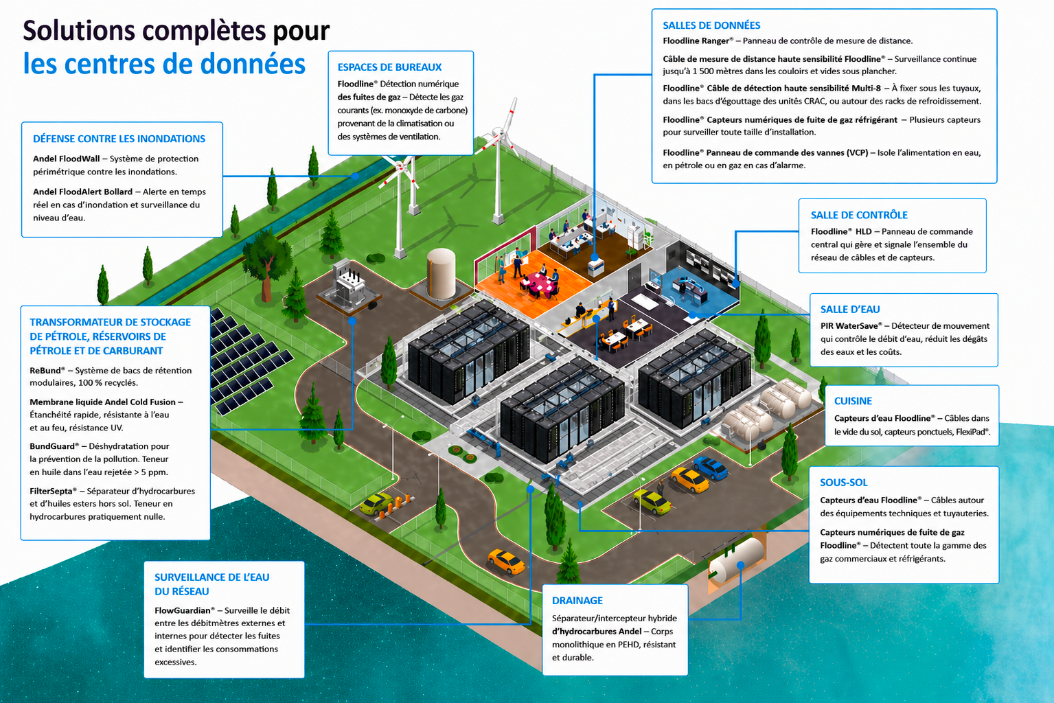L’intérêt de ces solutions réside dans leur complémentarité. Floodline® assure la détection et la supervision, le câble Multi-8 couvre les zones étendues, le capteur ponctuel sécurise les points critiques, BundGuard® protège les zones huile, ReBund® assure le confinement et FloodAlert anticipe les risques d’inondation.